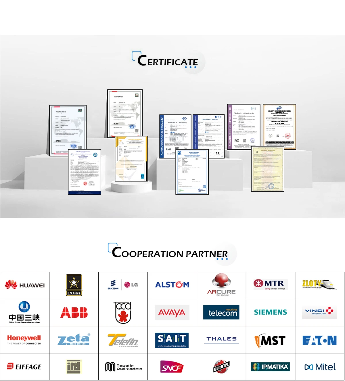 We hold national high-tech enterprise and management certifications like ISO9001, ISO14001, and ISO45001. Our products boast essential certifications such as CCC, CE, FCC, and RoHS for both domestic and international compliance and also hold safety certifications like IECEx, ATEX, EAC, INMETRO, along with product patents and software copyrights.